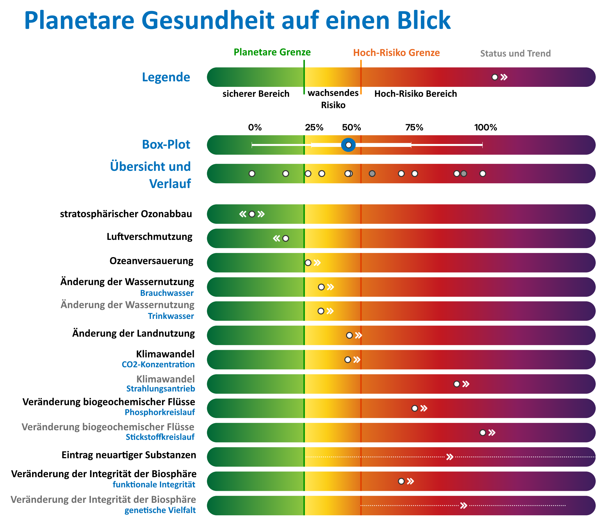 „Mehr als drei Viertel der lebenswichtigen Erdsystem-Funktionen befinden sich nicht mehr im sicheren Bereich. Die Menschheit verlässt ihren sicheren Handlungsraum und erhöht so das Risiko, den Planeten zu destabilisieren“.