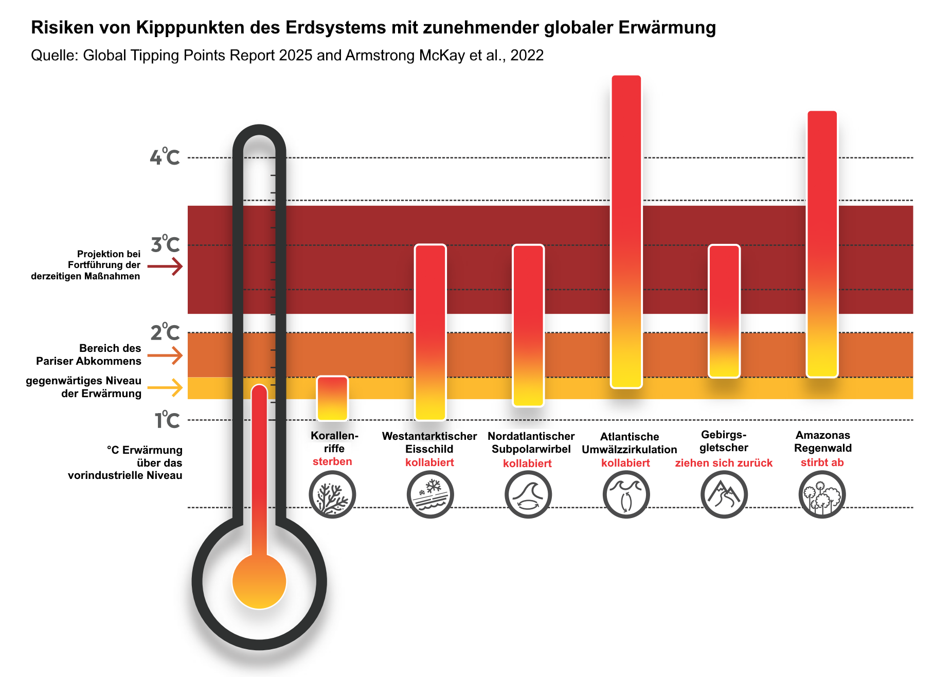 Mit der zunehmenden Erwärmung des Klimas steigt auch die Wahrscheinlichkeit, sogenannte Kipppunkte im Erdsystem zu überschreiten. Gemeint ist damit, dass bestimmte Erdsystemprozesse soweit aus dem bisherigen Gleichgewicht geraten, dass sie in ein neues, anderes Gleichgewicht kippen und nicht mehr in ihren vorherigen Zustand zurückkehren können. Die Veränderung ist irreversibel. Im Oktober wurde der „Global Tipping Points Report 2025“ veröffentlicht, der maßgeblich an der britischen Universität von Exeter erarbeitet wurde.